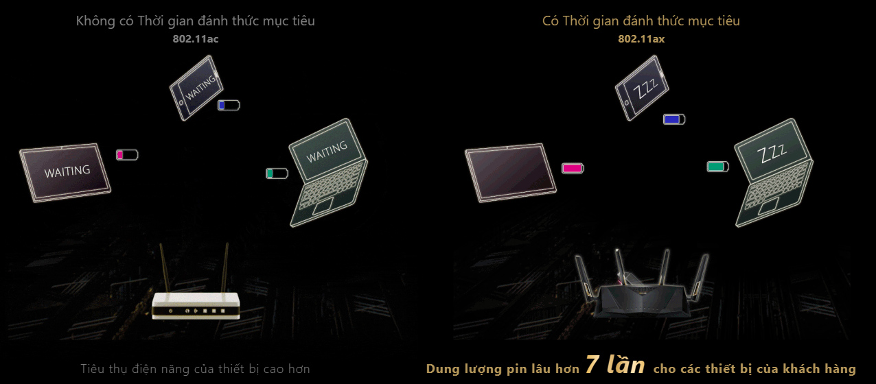 Thời gian đánh thức mục tiêu (TWT) cho phép RT-AX88U thiết lập các khoảng thời gian chỉ định cho các thiết bị phát dữ liệu. Điều này cho phép các thiết bị vào chế độ ngủ khi không cần tín hiệu bộ định tuyến, giảm được tiêu thụ điện năng tới 7 lần để tăng đáng kể dung lượng pin*.
