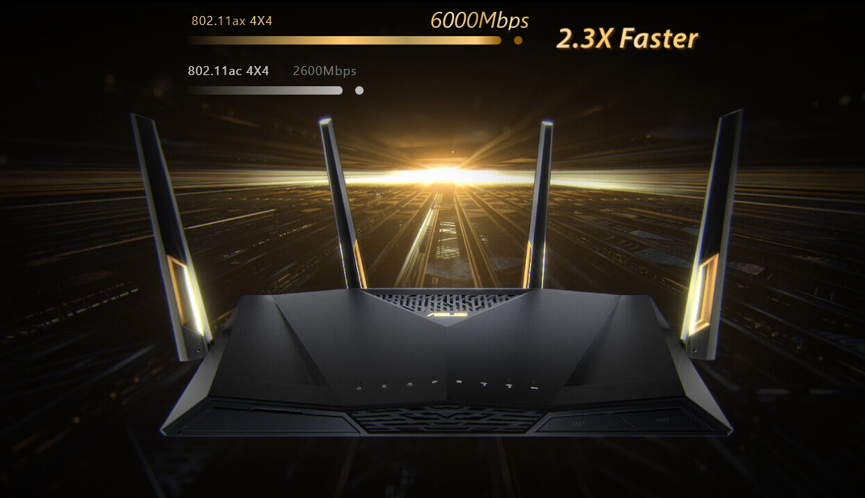 ASUS RT-AX88U là router sử dụng công nghệ sóng không dây mới nhất WiFi thế hệ thứ 6 hay còn gọi là chuẩn 802.11 ax chính thức sử dụng từ năm 2019. Có tốc độ kết nối và hiệu suất vượt trội với thế hệ WiFi 5 (chuẩn 802.11 ac)