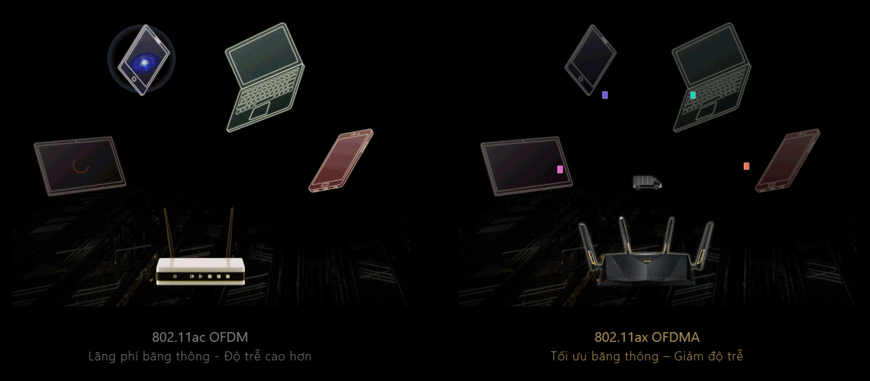 Với sự kết hợp mang tính cách mạng của công nghệ OFDMA và MU-MIMO, công nghệ 802.11ax cho dung lượng và hiệu suất mạng lớn hơn 4X trong các môi trường lưu lượng mạng cao. Wi-Fi 802.11ac thế hệ trước chỉ có thể xử lý một thiết bị tại mỗi thời điểm trên một kênh mạng, điều này tận dụng không hiệu quả băng thông hiện có. Hỗ trợ OFDMA trong chuẩn Wi-Fi 802.11ax chia mỗi kênh thành các kênh con, điều này cho phép bó và phát đồng thời các tín hiệu từ nhiều thiết bị*, do đó giảm được độ trễ để mang lại trải nghiệm Wi-Fi mượt hơn và nhạy hơn.