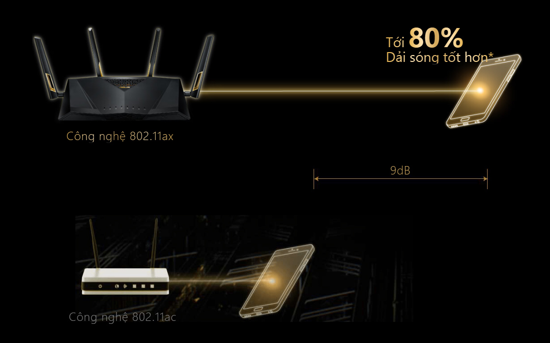 - * Để được hưởng lợi từ các tính năng 802.11ax, Wi-Fi khách hàng cần phải hỗ trợ 802.11ax.