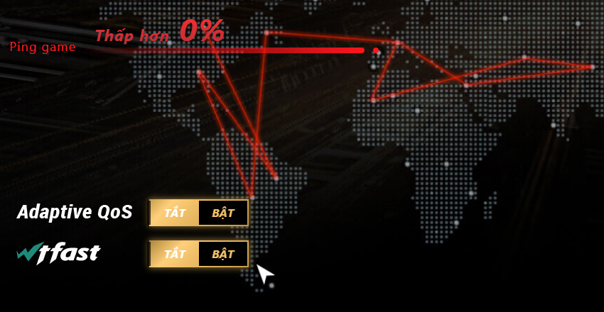 Adaptive QoS của RT-AX88U ưu tiên các gói game để chơi trực tuyến mượt hơn. Thiết bị được tích hợp wtfast® để tìm kiếm và bảo vệ đường đi ngắn nhất có thể giữa thiết bị chơi game và máy chủ game, giảm thiểu tối đa ping và độ trễ2 game.