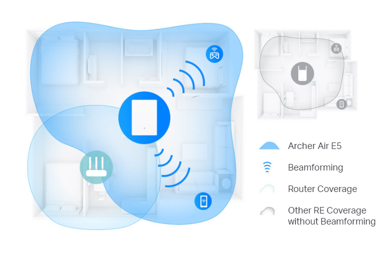 Được trang bị 4x FEM mạnh mẽ và ăng-ten thông minh tích hợp, Archer Air E5 tăng cường tín hiệu WiFi trong toàn bộ ngôi nhà của bạn. Công nghệ Beamforming phát hiện các thiết bị và tập trung tín hiệu về phía chúng, đặc biệt là ở những khu vực khó tiếp cận.