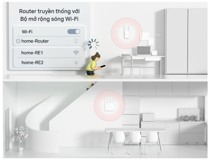 - Chuyển vùng thông minh: Đi bộ từ phòng này sang phòng khách mà vẫn duy trì tốc độ kết nối nhanh nhất có thể.§
