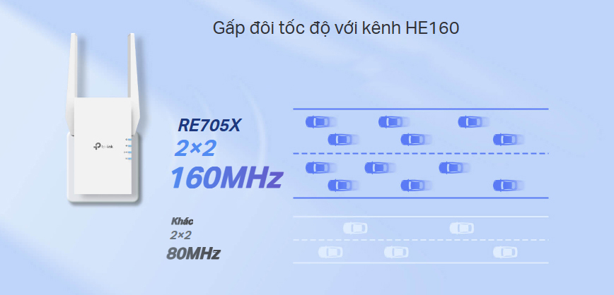 Hỗ trợ 2x2 160MHz trên băng tần 5G, tận hưởng băng thông rộng hơn cùng tốc độ cao hơn so với 80MHz truyền thống.‡