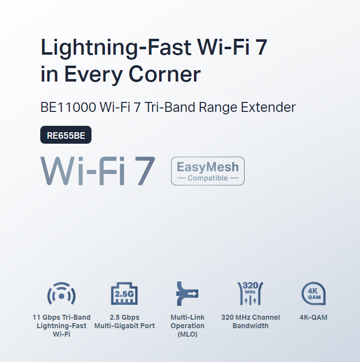 Bộ mở rộng phạm vi này có thể không hỗ trợ tất cả các tính năng bắt buộc theo quy định trong thông số kỹ thuật IEEE 802.11be. Có thể cần nâng cấp phần mềm thêm để tính năng khả dụng.