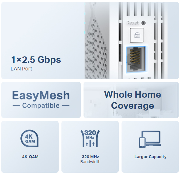 - Tương thích với EasyMesh: Hoạt động với bộ định tuyến EasyMesh và bộ mở rộng phạm vi để tạo thành Wi-Fi Mesh toàn nhà liền mạch, ngăn ngừa hiện tượng mất sóng và trễ khi di chuyển giữa các tín hiệu.*