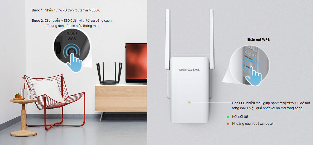 Nhấn nút WPS trên router và ME80X để mở rộng vùng phủ Wi-Fi trong vài giây.