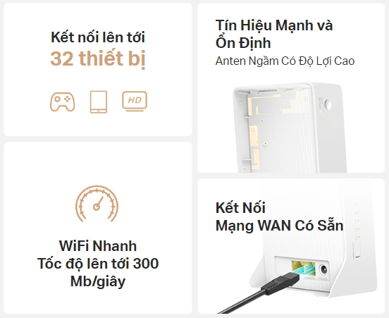 - 300 Mbps WiFi – WiFi Nhanh tốc độ lên tới 300 Mbps để chia sẻ mạng