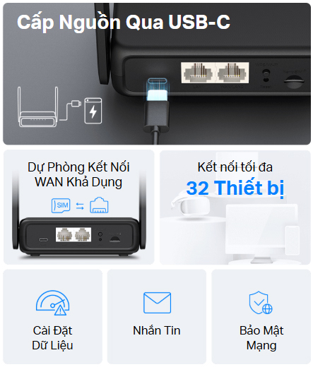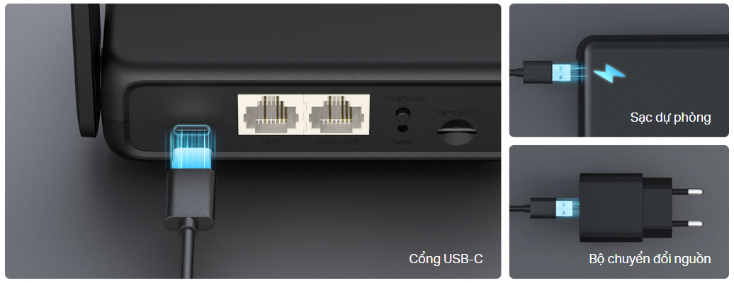 - Chế Độ Router Wi-Fi – Cắm cáp Ethernet vào cổng LAN/WAN để truy cập linh hoạt nếu bạn không thể kết nối 4G.