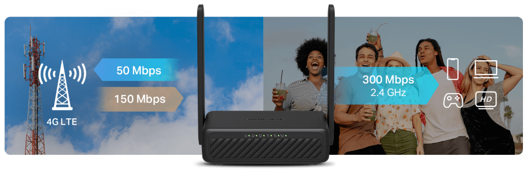 MB113-4G tận dụng công nghệ 4G LTE để mang lại tốc độ tải xuống cực nhanh lên đến 150 Mbps và tốc độ tải lên 50 Mbps△. Thiết bị cũng chia sẻ mạng Wi-Fi với tốc độ tối đa 300 Mbps trên băng tần 2.4 GHz—hoàn hảo để chơi game, phát trực tuyến và hơn thế nữa☆.