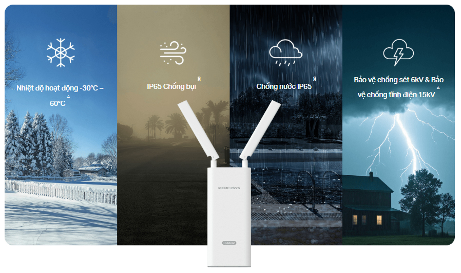 - Vỏ bọc ngoài trời bền bỉ – Khả năng kết nối và độ tin cậy cao ngoài trời với khả năng chống chịu thời tiết IP65 § và khả năng chống sét ±6kV & chống tĩnh điện ±15kV △ .