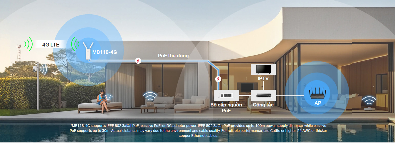 *MB118-4G hỗ trợ PoE chuẩn IEEE 802.3af/at, PoE thụ động hoặc nguồn điện từ bộ chuyển đổi DC. PoE chuẩn IEEE 802.3af/at cung cấp khoảng cách cấp nguồn lên đến 100m, trong khi PoE thụ động hỗ trợ lên đến 30m. Khoảng cách thực tế có thể thay đổi tùy thuộc vào môi trường và chất lượng cáp. Để đảm bảo hiệu suất ổn định, hãy sử dụng cáp Ethernet đồng Cat5e trở lên, cỡ 24 AWG hoặc dày hơn.
