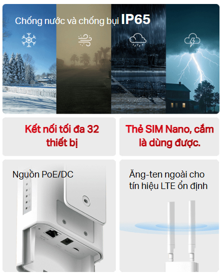 - Mạng 4G – Chia sẻ truy cập internet với tối đa 32 thiết bị Wi-Fi và tận hưởng tốc độ tải xuống lên đến 150 Mbps.