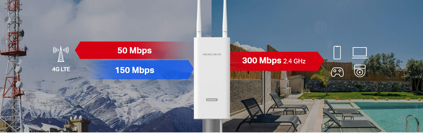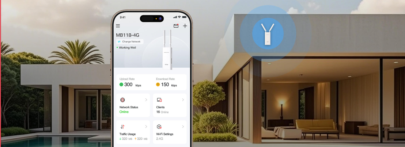 MB118-4G sử dụng công nghệ 4G LTE để cung cấp tốc độ tải xuống cực nhanh lên đến 150 Mbps và tốc độ tải lên lên đến 50 Mbps. ‡ Thiết bị này cũng chia sẻ mạng WiFi với tốc độ tối đa 300 Mbps trên băng tần 2.4 GHz — hoàn hảo cho chơi game, xem video trực tuyến và nhiều hơn nữa. †