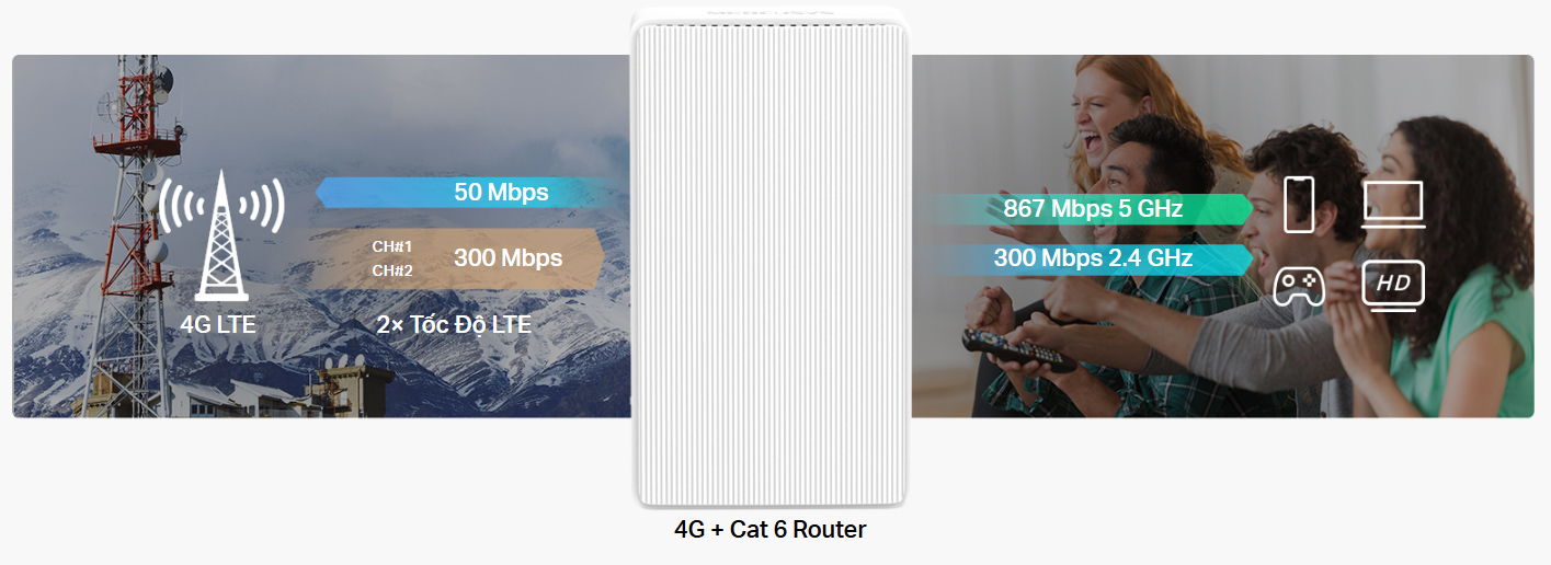 Bộ phát Router Mercusys 4G+ Cat6 AC1200 Gigabit Băng Tần Kép