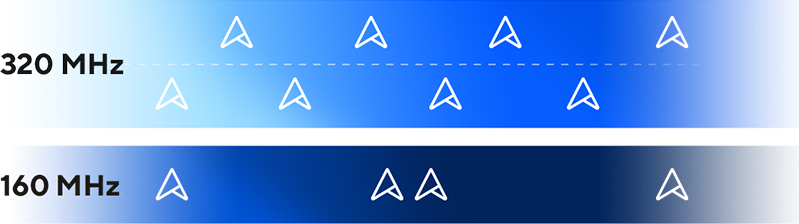 WiFi 7 giới thiệu ba kênh 320 MHz siêu rộng trong băng tần 6 GHz, tăng gấp đôi dung lượng truyền dữ liệu. Tính năng này cho phép truyền dữ liệu đồng thời nhiều hơn đáng kể với tốc độ nhanh nhất có thể.