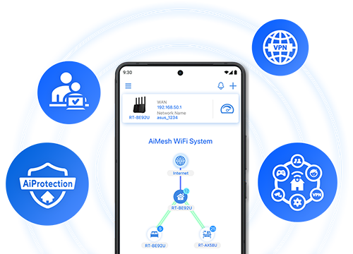RT-BE92U khai thác sức mạnh của WiFi 7 và công nghệ AiMesh thông minh thế hệ tiếp theo để mang lại vùng phủ sóng rộng hơn, mạng ổn định và an toàn hơn cùng trải nghiệm mạng phong phú tính năng – tất cả dưới một tên mạng duy nhất cho toàn bộ ngôi nhà thông minh của bạn.