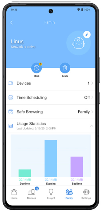 Theo dõi việc sử dụng Internet của con bạn thông qua bảng điều khiển đồ họa toàn diện. Xem nhanh thời gian trực tuyến, mức tiêu thụ dữ liệu và hoạt động cụ thể trên thiết bị của con.