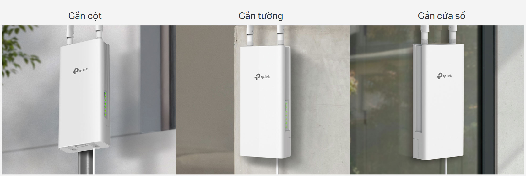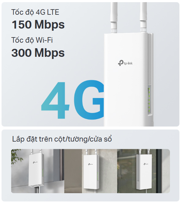 TL-MR100-Outdoor hỗ trợ nhiều phương án lắp đặt — gắn lên cột, tường hoặc dán lên cửa sổ. Tính linh hoạt này phù hợp với nhiều môi trường, từ thành thị đến nông thôn. Dễ dàng tìm vị trí tối ưu để đảm bảo tín hiệu và kết nối ổn định.