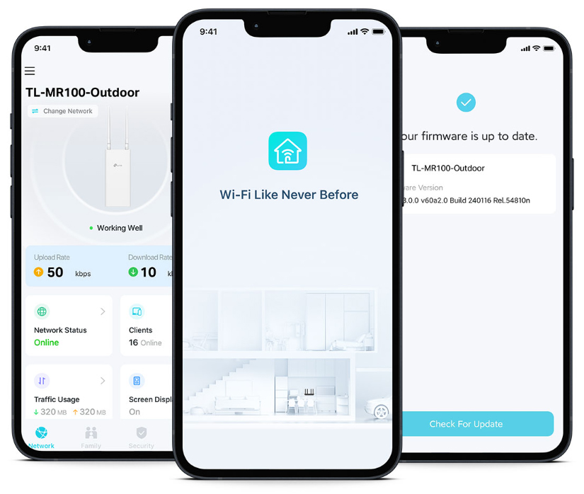 Thiết lập TL-MR100-Outdoor chỉ trong vài phút nhờ giao diện web trực quan và ứng dụng Tether mạnh mẽ. Tether cũng cho phép bạn quản lý cài đặt mạng từ thiết bị Android hoặc iOS, bao gồm kiểm soát của phụ huynh và quyền truy cập.