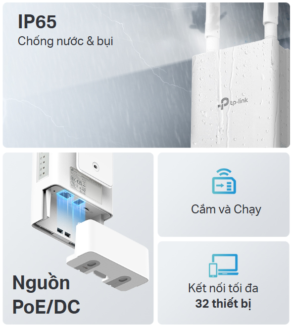 TL-MR100-Outdoor hỗ trợ nguồn PoE và DC, giúp đơn giản hóa quá trình lắp đặt ngoài trời với các tùy chọn cấp nguồn linh hoạt, đảm bảo kết nối đáng tin cậy ở nhiều môi trường ngoài trời khác nhau.