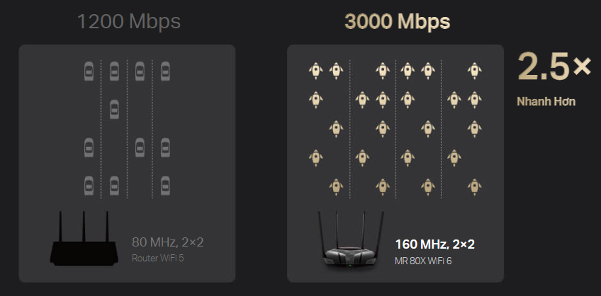 Gấp đôi băng thông với kênh 160 MHz1 ,MR80X không giới hạn độ rộng kênh trước đây và cung cấp tốc độ cao cho thiết bị của bạn. Với tốc độ WiFi 6 lên tới 3 Gbps,2 tải các tập tin lớn trong vài phút và trải nghiệm phát video 4K mượt mà.