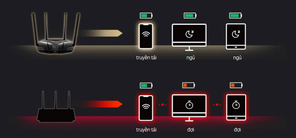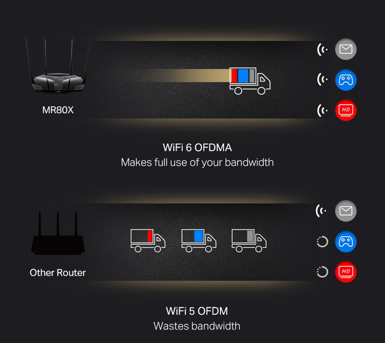 Phát trực tuyến hoặc chơi game trên nhiều thiết bị mang lại nhiều niềm vui hơn mà không làm giảm hiệu suất. MR80X hỗ trợ OFDMA và MU-MIMO1 để tăng sức mạnh cho WiFi của bạn bằng cách cho phép nhiều máy khách truyền tải cùng một lúc. Điều này mang lại hiệu quả và dung lượng mạng lớn gấp 4 lần trong môi trường dày đặc lưu lượng truy cập.3
