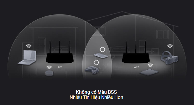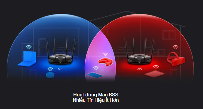 - WIFI ÍT NHIỄU HƠN – Giảm nhiễu xuống mức thấp nhấy từ tín hiệu lân cận để cải thiện hiệu suất truyền tải với màu BSS