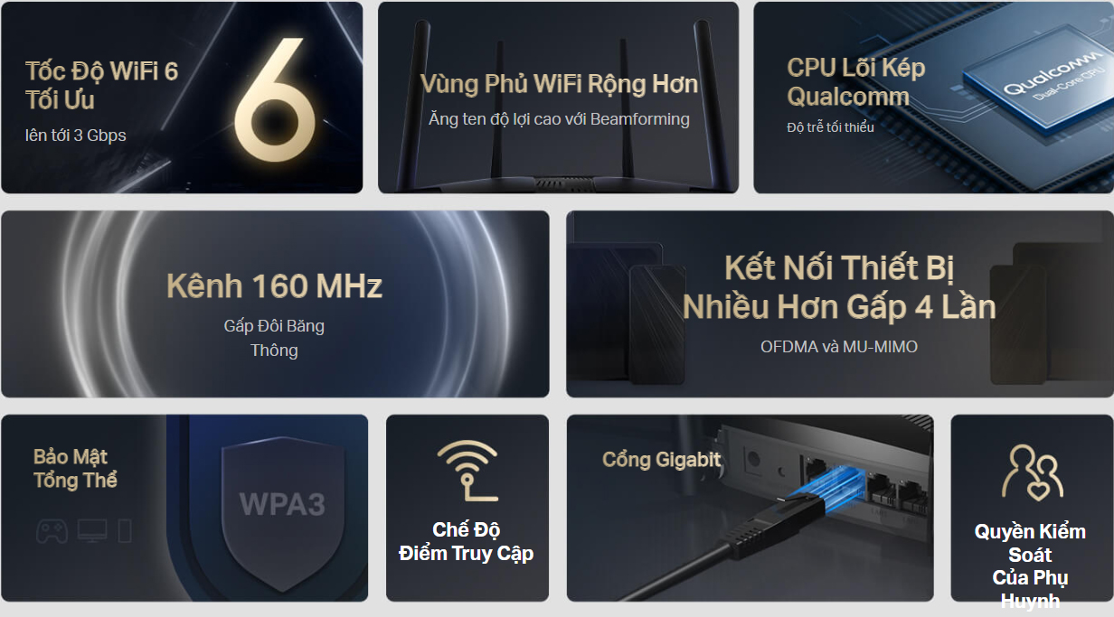 1. Việc sử dụng 802.11ax (Wi-Fi 6) và các tính năng bao gồm OFDMA, Kênh 160 MHz, MU-MIMO, 1024-QAM, Màu BSS và Thời Gian Đánh Thức Mục Tiêu (Target Wake Time - TWT) yêu cầu máy khách cũng phải hỗ trợ các tính năng tương ứng. Việc giảm công suất thực tế theo Thời gian Đánh thức Mục tiêu có thể thay đổi do điều kiện mạng, giới hạn của máy khách và các yếu tố môi trường. Băng thông 160 MHz có thể không khả dụng ở băng tần 5 GHz ở một số khu vực / quốc gia do các hạn chế theo quy định. 2. Tốc độ tín hiệu không dây tối đa là tốc độ vật lý có được từ các thông số kỹ thuật của Chuẩn IEEE 802.11. Thông lượng dữ liệu không dây thực tế và vùng phủ sóng không dây không được đảm bảo và sẽ thay đổi do điều kiện mạng, giới hạn của máy khách và các yếu tố môi trường, bao gồm vật liệu xây dựng, chướng ngại vật, khối lượng và mật độ lưu lượng cũng như vị trí của máy khách. 3. White Paper 802.11ax xác định các sửa đổi được tiêu chuẩn hóa cho cả lớp vật lý IEEE 802.11 (PHY) và lớp Kiểm soát truy cập phương tiện IEEE 802.11 (MAC) để cho phép ít nhất một chế độ hoạt động có khả năng hỗ trợ cải thiện ít nhất bốn lần thông lượng trung bình trên mỗi trạm (được đo tại điểm truy cập dịch vụ dữ liệu MAC) trong một môi trường triển khai dày đặc. 4. Việc sử dụng WPA3 yêu cầu máy khách cũng phải hỗ trợ WPA3. 5. "256 thiết bị" là tổng số kết nối được kết hợp cho 2.4 GHz và 5 GHz trong điều kiện phòng thí nghiệm.