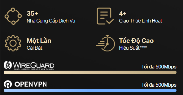 Hỗ trợ OpenVPN, WireGuard, PPTP và L2TP/IPsec — hoạt động với hơn 35 nhà cung cấp chính thống để truy cập an toàn, linh hoạt.***
