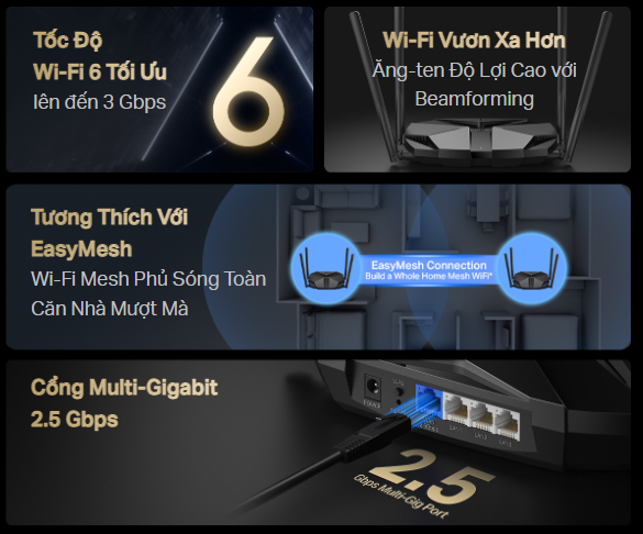 †Tốc độ tín hiệu không dây tối đa là tốc độ vật lý bắt nguồn từ các thông số kỹ thuật của Chuẩn IEEE 802.11. Thông lượng dữ liệu không dây thực tế, vùng phủ sóng không dây và số lượng thiết bị được kết nối không được đảm bảo và sẽ thay đổi do điều kiện mạng, giới hạn của máy khách và các yếu tố môi trường, bao gồm vật liệu xây dựng, chướng ngại vật, khối lượng và mật độ lưu lượng truy cập cũng như vị trí của máy khách. ‡Việc sử dụng 802.11ax (Wi-Fi 6) và các tính năng bao gồm OFDMA, MU-MIMO, 1024-QAM, BSS Color và Target Wake Time yêu cầu máy khách cũng phải hỗ trợ các tính năng tương ứng. Việc giảm điện năng tiêu thụ thực tế nhờ Target Wake Time có thể thay đổi tùy thuộc vào điều kiện mạng, giới hạn của máy khách và các yếu tố môi trường. Router này có thể không hỗ trợ tất cả các tính năng bắt buộc được phê chuẩn trong Dự thảo 3.0 của thông số kỹ thuật IEEE 802.11AX. Có thể cần nâng cấp thêm phần mềm để khả dụng tính năng. §Sách trắng 802.11ax định nghĩa các sửa đổi tiêu chuẩn cho cả lớp vật lý IEEE 802.11 (PHY) và lớp Điều khiển Truy cập Môi trường IEEE 802.11 (MAC) nhằm cho phép ít nhất một chế độ hoạt động có khả năng hỗ trợ cải thiện ít nhất bốn lần thông lượng trung bình trên mỗi trạm (được đo tại điểm truy cập dịch vụ dữ liệu MAC) trong kịch bản triển khai mật độ cao. △Việc sử dụng WPA3 yêu cầu máy khách cũng phải hỗ trợ WPA3. *Các sản phẩm tương thích EasyMesh có thể kết nối mạng với các thiết bị khác sử dụng EasyMesh. Kết nối thất bại có thể do xung đột firmware của các nhà cung cấp khác nhau. Chức năng tương thích EasyMesh vẫn đang được phát triển trên một số model và sẽ được hỗ trợ trong các bản cập nhật phần mềm tiếp theo. Sản phẩm này tương thích với công nghệ EasyMesh tiêu chuẩn nhưng chưa đạt được chứng nhận Wi-Fi EasyMeshTM. **Tốc độ internet 2.5 Gbps yêu cầu gói dịch vụ và thiết bị tương thích. Các cổng 2.5 Gbps và Gigabit không thể được cấu hình đồng thời làm cổng WAN. ***Các thử nghiệm được tiến hành trên mạng nội bộ. Tốc độ thực tế có thể khác nhau tùy thuộc vào cấu hình mạng của bạn. ****Phí đăng ký dịch vụ VPN phải được mua riêng từ các nhà cung cấp VPN tương ứng. Các giao thức VPN được hỗ trợ (OpenVPN/WireGuard) có thể khác nhau tùy theo nhà cung cấp và kịch bản sử dụng (ví dụ: cài đặt ứng dụng so với cài đặt trên router). Vui lòng xác minh tính tương thích với các tài nguyên chính thức của từng dịch vụ VPN trước khi cấu hình.