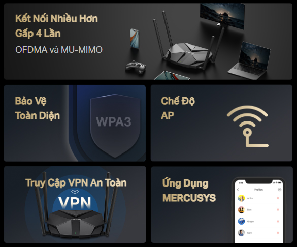- KẾT NỐI NHIỀU THIẾT BỊ HƠN, VUI HƠN – Hỗ trợ MU-MIMO và OFDMA để giảm tắc nghẽn và tăng gấp bốn lần thông lượng trung bình.