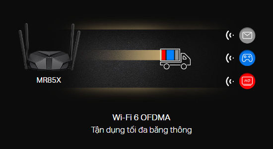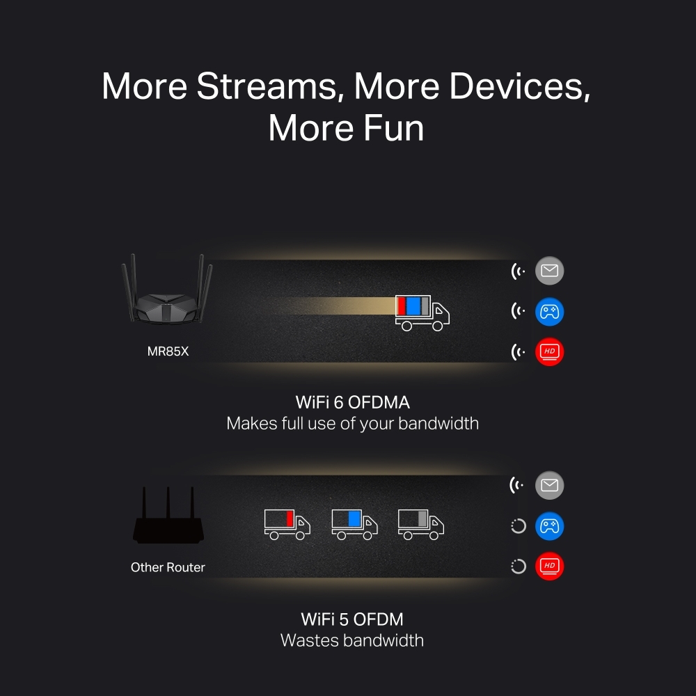 Phát trực tuyến hoặc chơi game trên nhiều thiết bị mang lại nhiều niềm vui hơn mà không làm giảm hiệu suất. MR85X hỗ trợ OFDMA và MU-MIMO† để tăng cường sức mạnh Wi-Fi của bạn bằng cách cho phép nhiều máy khách truyền tải cùng một lúc. Điều này mang lại dung lượng mạng và hiệu quả cao gấp 4 lần trong môi trường lưu lượng truy cập dày đặc. §