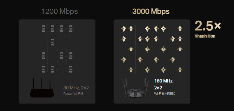 Nhân đôi băng thông với các kênh 160 MHz,† MR85X mở khóa các giới hạn của độ rộng kênh trước đó và cung cấp tốc độ cấp độ tiếp theo cho thiết bị của bạn. Với tốc độ Wi-Fi 6 lên đến 3 Gbps,‡ hoàn thành tải xuống các tập tin lớn trong vài phút và trải nghiệm phát trực tuyến 4K tuyệt đẹp mà không bị giật lag.