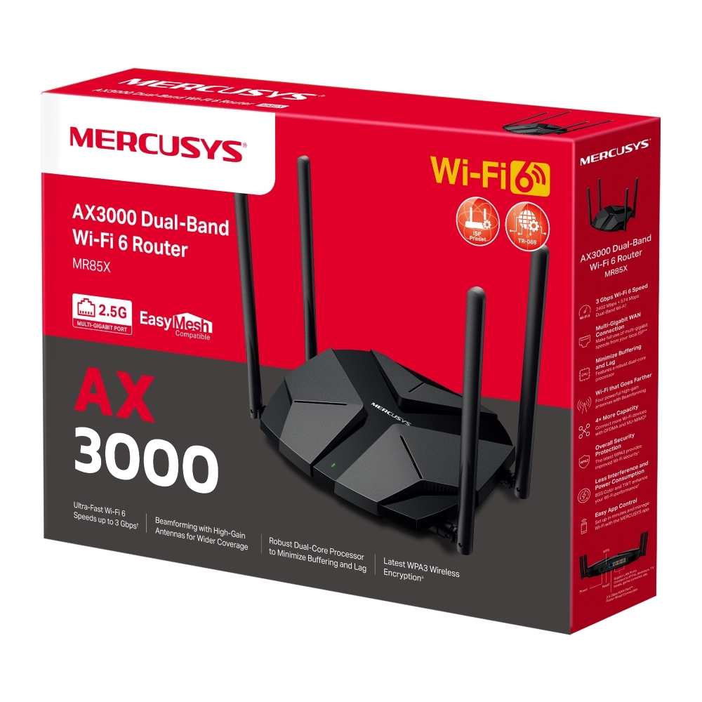 Mercusys MR85X là một bộ định tuyến (router) Wi-Fi 6 băng tần kép chuẩn AX3000, nổi bật với cổng kết nối tốc độ cao 2.5 Gbps.