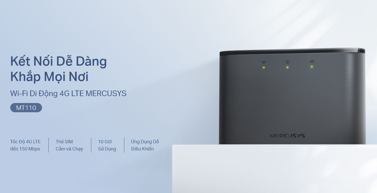 MT110 sử dụng công nghệ 4G LTE để đạt tốc độ Internet siêu nhanh lên đến 150 Mbps tải xuống và 50 Mbps tải lên, đồng thời chia sẻ mạng Wi-Fi với tốc độ tối đa 150 Mbps trên băng tần 2,4 GHz để chơi game, phát trực tuyến và hơn thế nữa.