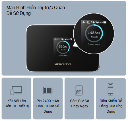 - Màn hình hiển thị trực quan để sử dụng dễ dàng hơn – Xem nhanh mọi thông tin hữu ích. Giúp bạn dễ dàng kiểm soát dung lượng dữ liệu và tránh vượt quá giới hạn hàng tháng.
