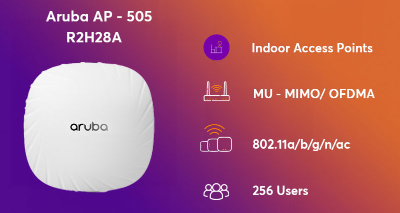Bộ thu phát Wifi R2H28A Aruba AP 505 (RW) chuẩn Wifi 6 Indoor Dual Radio 2x2:2 802.11ax Internal Antennas Unified Campus AP. Đáp ứng các kết nối tốc độ cao, bảo mật an toàn cho người dùng, tích hợp công nghệ lọc và tối ưu hóa kênh đảm bảo cho thiết bị luôn chịu tải cực tốt, tránh được các vấn đề quá tải và nghẽn mạng. Với mức giá phải chăng lắp đặt và cài đặt dễ dàng đây là sản phẩm Wifi đang được ưa chuộng sử dụng rộng rãi trên thị trường.