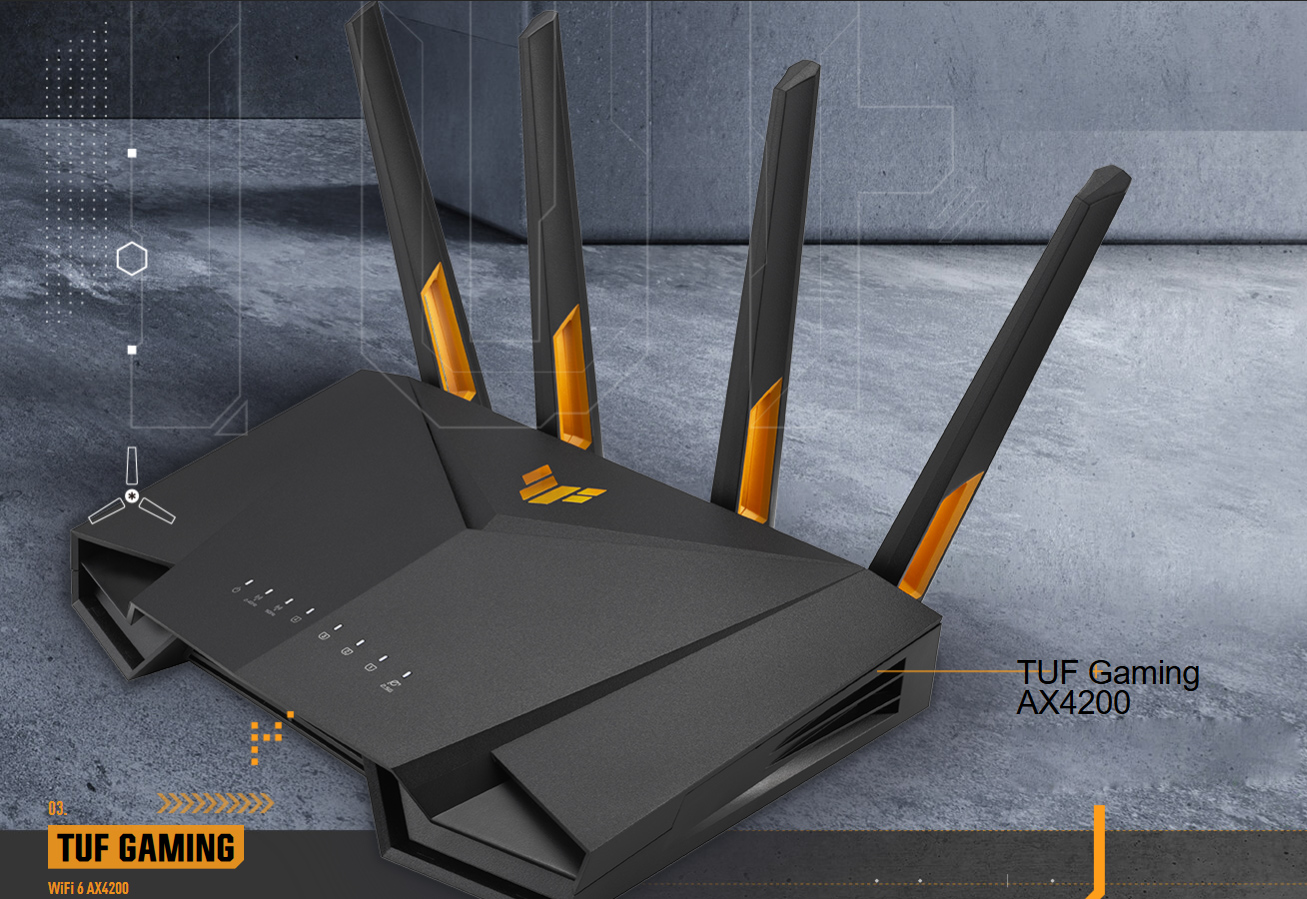 Bộ định tuyến chơi game WiFi 6 kép TUF Gaming AX4200 của ASUS với Chế độ Trò chơi di động, Chế độ chuyển tiếp cổng 3 bước, cổng 2.5Gbps, AiMesh cho mạng lưới WiFi lưới, bảo mật mạng AiProtection Pro