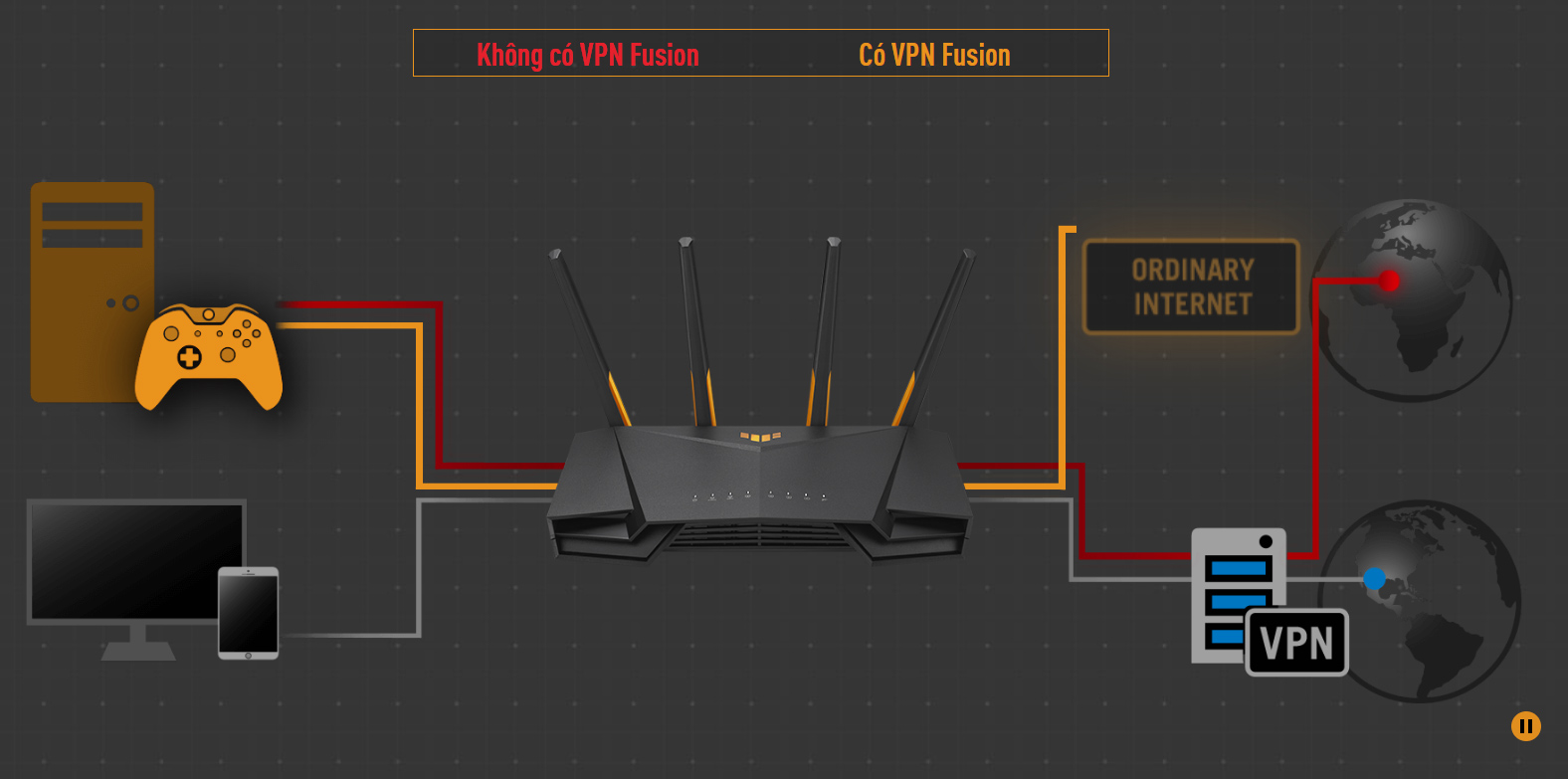 VPN Fusion cho phép bạn chạy cùng lúc cả một kết nối VPN và một kết nối internet thông thường! Do đó, ngay cả khi người dùng mạng khác cần sử dụng VPN, bạn vẫn có thể tận hưởng tốc độ chơi game tối đa.