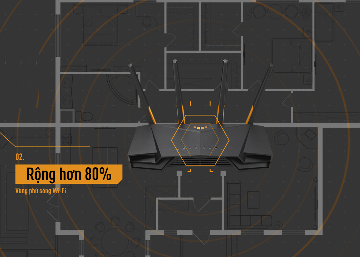 Chúng tôi đã thiết kế TUF Gaming AX4200 để mang đến cho bạn phạm vi phủ sóng WiFi rộng nhất có thể. Nó sử dụng OFDMA, công nghệ mới trong WiFi 6 cho phép tín hiệu đi xa hơn so với WiFi 5. Kèm theo các cải tiến khác như beamforming, tập trung tín hiệu vào mỗi thiết bị, TUF Gaming AX4200 đạt được mọi góc phủ sóng.