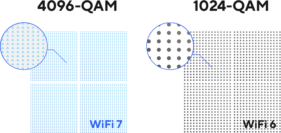 So với 1024-QAM của WiFi 6/6E, 4096-QAM cho phép mỗi tín hiệu kết hợp mật độ dữ liệu lớn hơn, mang lại hiệu quả truyền dữ liệu cao hơn tới 20%*.