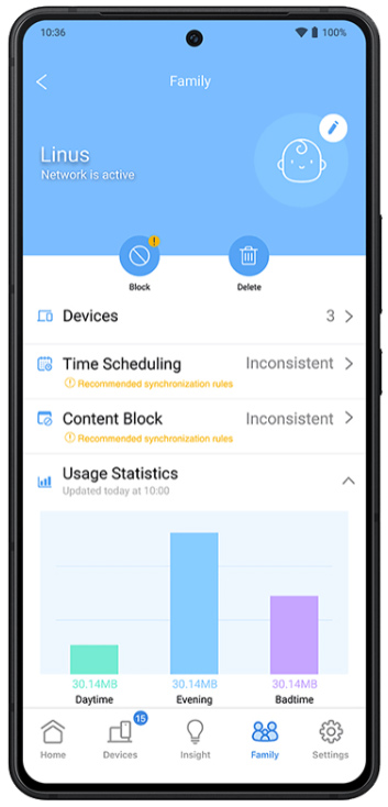 Theo dõi việc sử dụng Internet của con bạn thông qua bảng điều khiển đồ họa toàn diện. Xem nhanh thời gian trực tuyến, mức tiêu thụ dữ liệu và hoạt động cụ thể trên thiết bị của con.