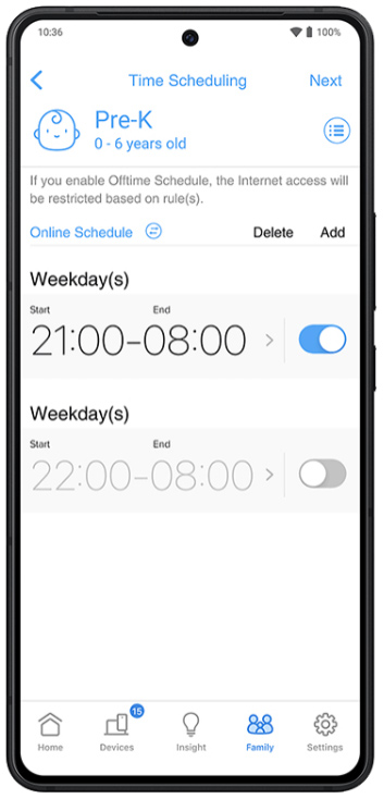 Xác định giờ trực tuyến và ngoại tuyến cho mỗi trẻ, đảm bảo thời gian sử dụng màn hình cân bằng và nuôi dưỡng thói quen kỹ thuật số lành mạnh. Khen thưởng cho hành vi tốt bằng cách tăng thêm thời gian trực tuyến như một sự củng cố tích cực.