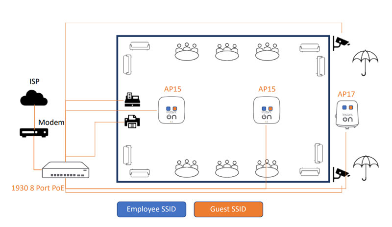 - Nhà hàng, quán cafe: Với những mô hình nhà hàng, quán cafe diện tích nhỏ Aruba Instant On AP15 (R2X06A) cung cấp tốc độ truyền tải cao trên băng tần 5GHz, đáp ứng được 50 thiết bị cùng sử dụng đồng thời.