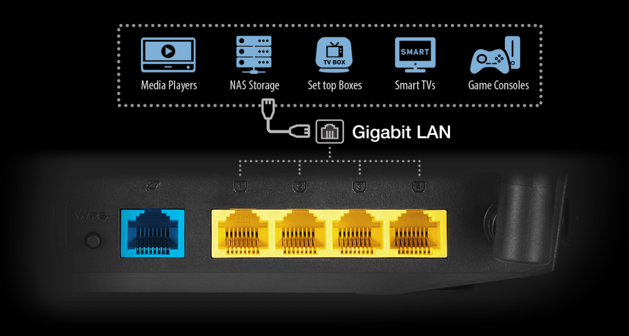 RT-AC59U V2 được trang bị bốn cổng Gigabit LAN hỗ trợ đồng thời tốc độ lên tới 4Gbps. TV thông minh, bộ điều khiển game, hộp cáp, trình phát đa phương tiện, thiết bị lưu trữ NAS và nhiều thiết bị khác hiện nay có thể có cổng chuyên dụng để biến RT-AC59U V2 thành hub đa phương tiện không giật ngay tại nhà của bạn.