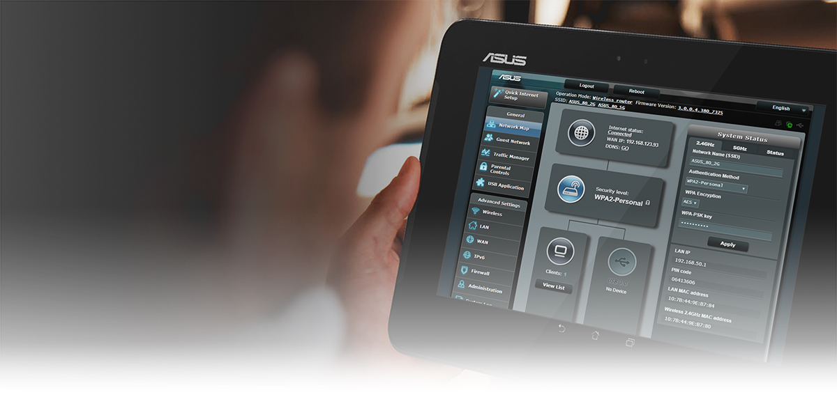 Với UI (giao diện) bảng điều khiển ASUSWRT, có thể cài đặt, theo dõi và điều khiển trực quan mọi ứng dụng mạng tại một nơi. Chỉ với 30 giây cài đặt, chức năng phát hiện đa thiết bị và các thiết lập linh hoạt, ASUSWRT sẽ khai thác tối đa hiệu suất mạng của bạn.