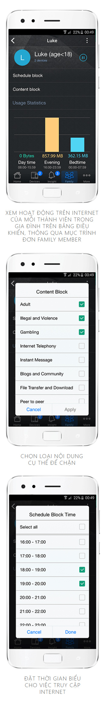 ASUS Blue Cave cho phép bạn theo dõi chặt chẽ việc sử dụng Internet của gia đình và quyết định thời lượng truy cập internet hay ứng dụng nào được phép sử dụng bởi mỗi thành viên trong gia đình. Kiểm soát của phụ huynh tân tiến cho phép bạn chặn các thể loại ứng dụng di động và trang web cụ thể - và áp dụng các cài đặt này cho tất cả các thiết bị thuộc về thành viên trong gia đình - trong khi cho phép truy cập tự do vào phần còn lại của Internet.