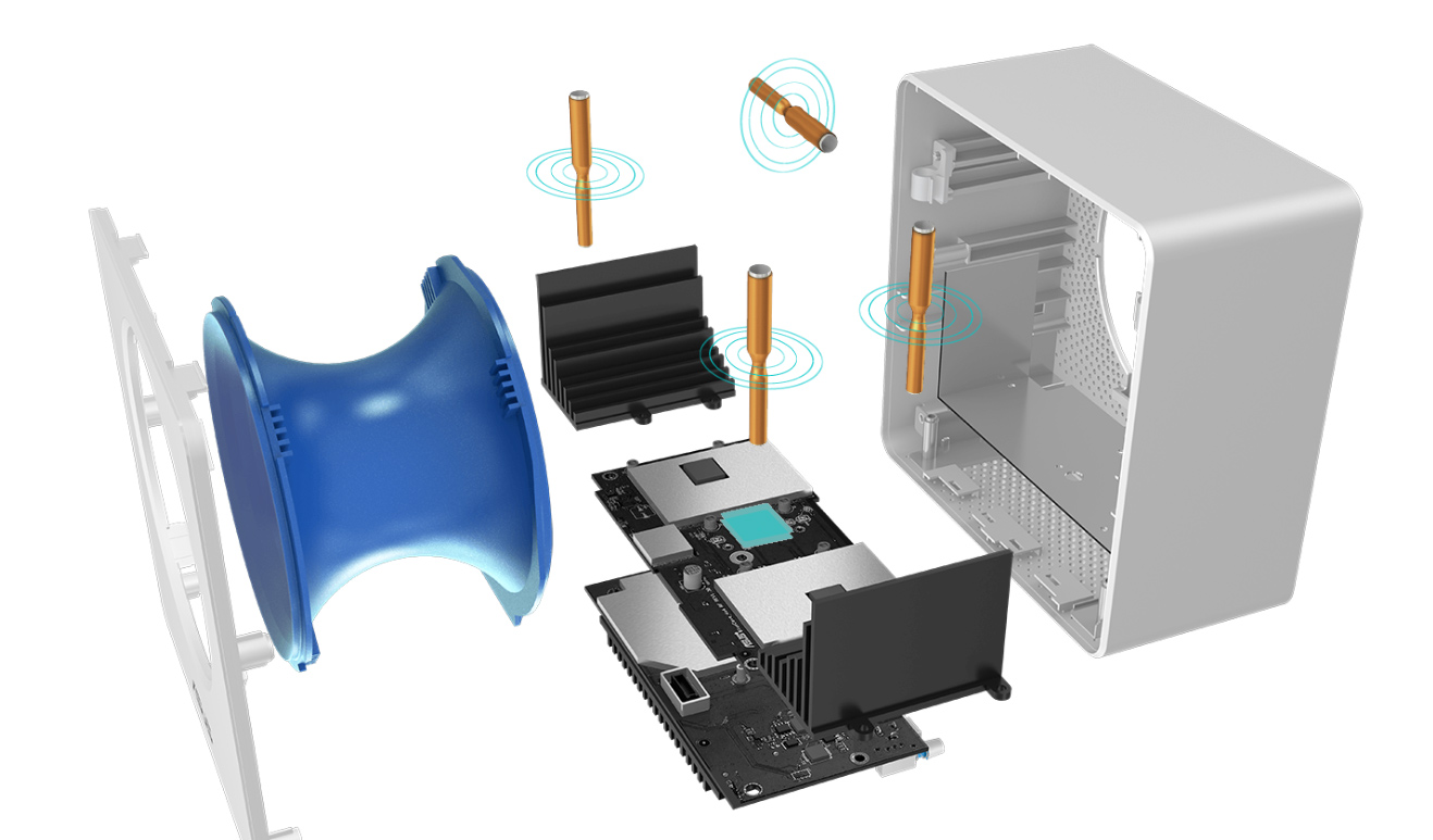 Phong cách độc nhất và hiệu năng mạnh mẽ của Blue Cave đều được tạo ra bởi kỹ thuật WiFi tối tân của chúng tôi. Ăng ten gắn trong thường mang tính thỏa hiệp khi chúng cho phép thiết kế gọn gàng song lại dễ dàng bị nhiễu. Trên Blue Cave, bốn ăng ten được tối ưu hóa đầy đủ thực sự làm tốt hơn các ăng ten gắn ngoài đến 28%. Vị trí và hướng của các ăng ten cân xứng với nhau và với mạch điện bên trong được quyết định cẩn thận bằng các cuộc thử nghiệm để đem lại tín hiệu WiFi tốt nhất có thể theo mọi hướng: vùng bao phủ rộng nhất đạt được với ba ăng ten đặt dọc và một ăng ten nằm ngang. Bảng mạch siêu mỏng và lớp tản nhiệt phù graphit tùy chỉnh được thiết kế đặc biệt để tận dụng tốt nhất khoảng không bên trong.