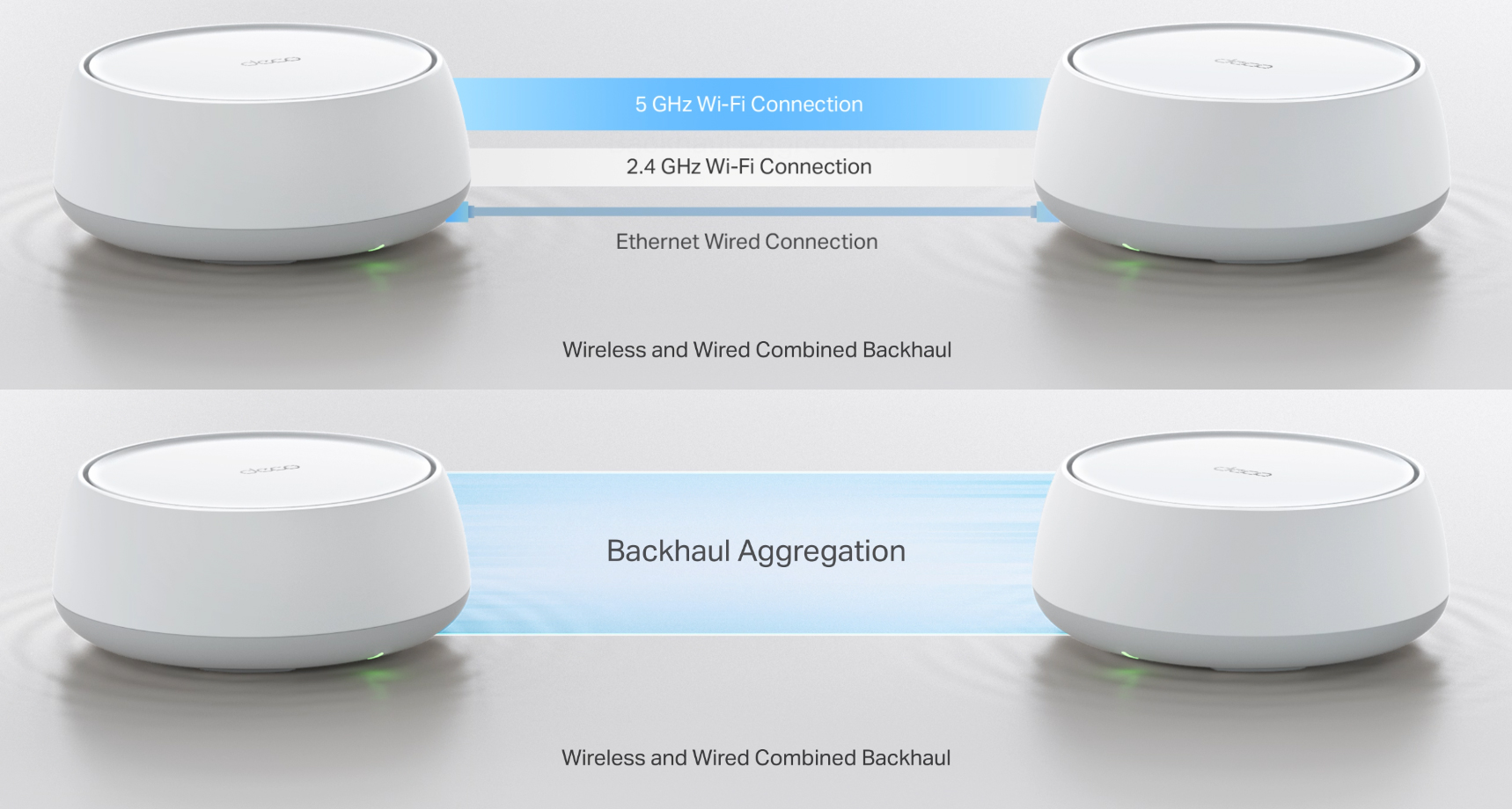 - Kết hợp backhaul không dây và có dây – Kết nối backhaul không dây và có dây với từng thiết bị đồng thời để cải thiện tổng băng thông và giảm độ trễ.